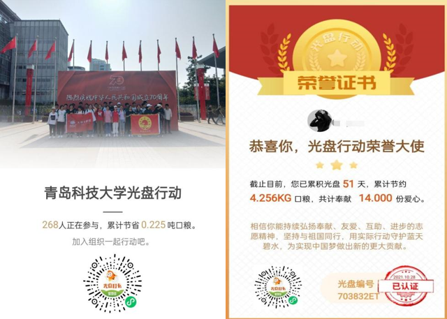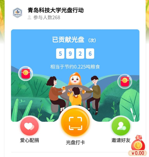 本次“光盘打卡”活动载体——光盘打卡小程序,由免费午餐基金会提供。志愿者们通过扫描光盘来获得能量,五次打卡即可向雨花素食公益餐厅捐赠一次免费午餐。青尘义工队组建了青岛科技大学光盘打卡队伍,我们在这里继续向全校同学呼吁:响应起来,参与进来,将勤俭节约的好习惯真正的付诸行动,共同节约粮食,保护环境。