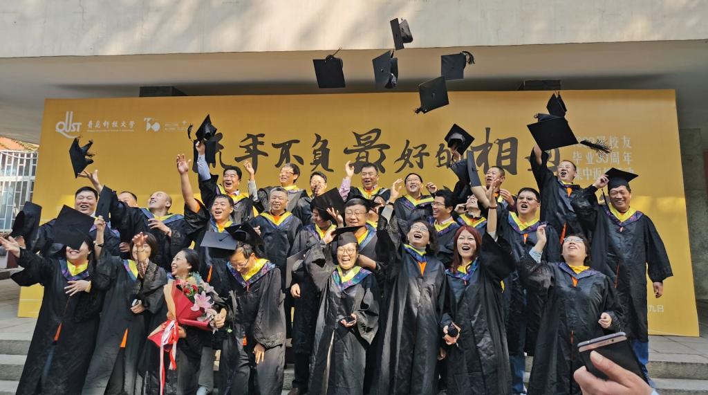 还为校友们准备了精美的纪念品——内含校友宣传视频的优盘等等,大家穿上学士服,与到场的同学们一同拍照留念。